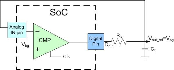 The circuit uses a synchronous comparator in SoC, and an external low pass filter as shown in Figure 3. The output of the low pass filter is the feedback, through an analog input pin, to the negative input of the comparator. The comparator with this feedback follows the same rules as an operational amplifier in voltage follower mode. The output of the voltage follower will change, as required, to keep its two inputs at the same level. If the value on the positive input is higher than the value on the negative input, the output is high. The high output will cause the output of the low pass filter to drift higher, eventually making the negative input to the comparator higher than the positive input. When the negative input is higher, the output remains low, which will pull the negative input lower. Thus the percentage of time that the signal is high, i.e. the density of the signal, changes to keep the two inputs at the same value. Eventually this will reach a stable state where it modulates its own output so that its density results in Vref = Vbg on the output of the low pass filter. Since the comparator is clocked, its output is a well-defined digital signal that is low-pass filtered to obtain a DC reference voltage.
