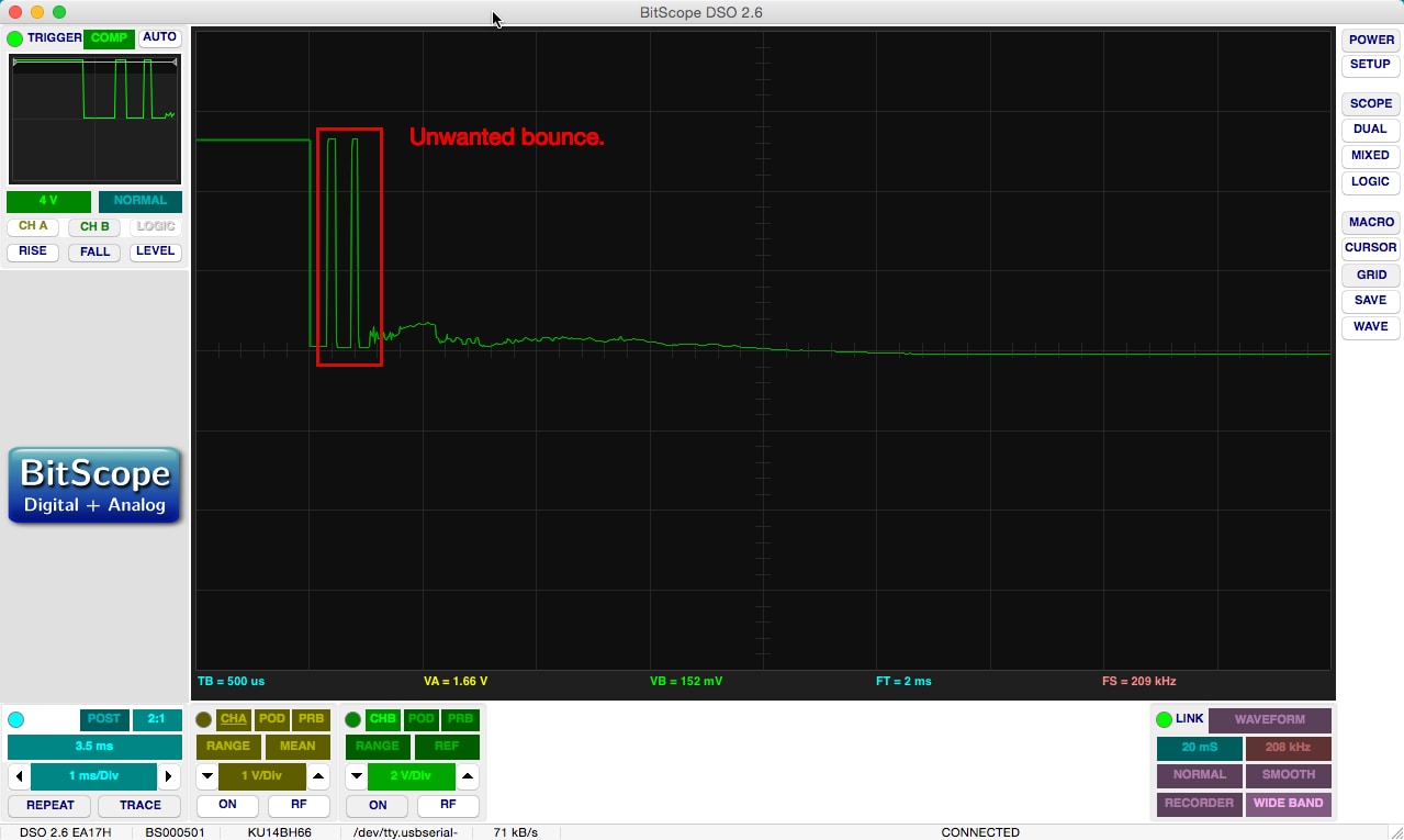 Mechanical buttons and switches can present unintended input trouble for embedded electronics projects. There’s an undesired effect known as “bounce.” What is bounce? When you press a button it sometimes does not cleanly change states. There is some electrical noise generated as the button rapidly oscillates between states immediately after a button is pressed but before it settles. Think of it like pulling a mass-spring system downward, letting go, and waiting for it to settle at equilibrium. Switches and buttons oscillate similarly, though the time to settle is measured in milliseconds. Let’s take a look at bounce on an oscilloscope: