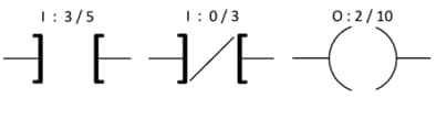 Figure 2: Common ladder logic symbols. L to R: examine on (EON), examine off (EOF), and output energize (OUT). (Source: Green Shoe Garage)